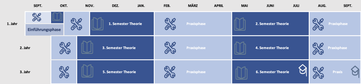 Den Bachelor of Arts (B.A.) können Studierende in nur 3 Jahren / 6 Semestern erwerben, wobei sie 50% ihrer Studienzeit im Unternehmen sind.