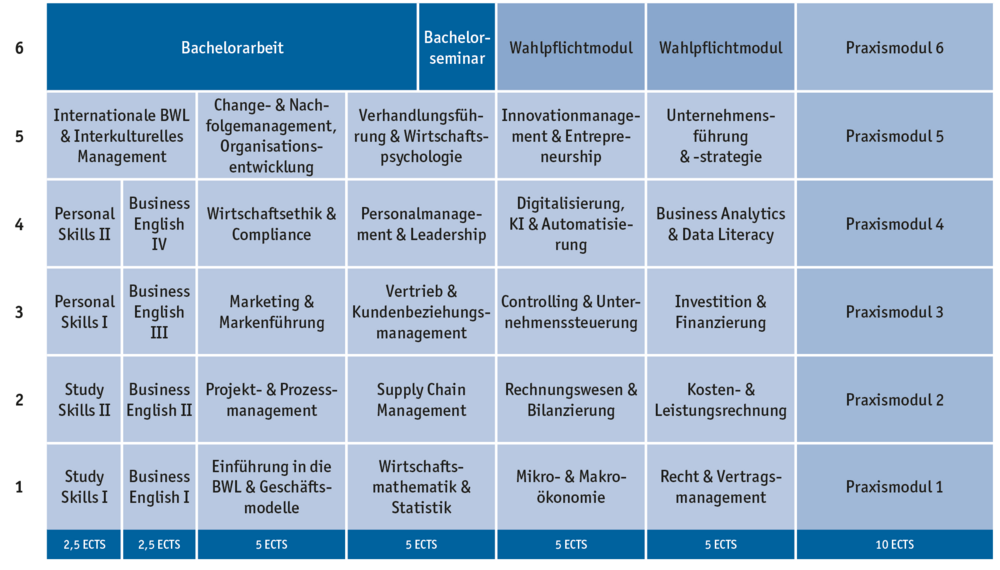Im ersten Studienjahr lernst du die nötigen betriebswirtschaftlichen Grundlagen sowie die operativen Bereiche im Unternehmen kennen; sozusagen das unternehmerische Kerngeschäft. Auch fürs Studium benötigst du gewisse Grundlagen: hier werden beispielsweise gutes Selbst- und Zeitmanagement oder wissenschaftliche Arbeits- und Herangehensweisen vermittelt.