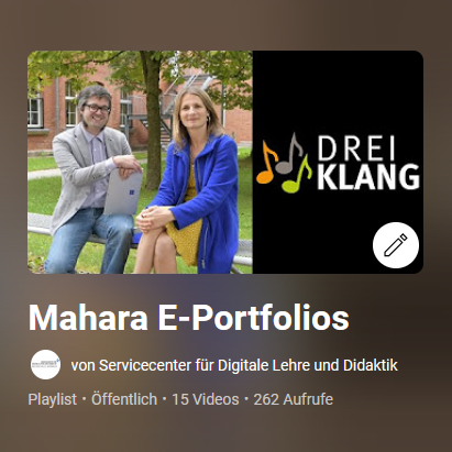 Über den Youtube-Kanal des Servicecenters für digitale Lehre und Didaktik der Hochschule Ansbach stellt das 3-Klang-Team eine Mahara-Playlist mit Erklärvideos zu verschiedenen E-Portfolio-Funktionen zur Verfügung. 2024 kamen 4 neue Videos hinzu (Imagevideo Studierendenperspektive, Imagevideo Lehrendenperspektive, Imagevideo studiengangsweiter Nutzen, Reel „natürlich nutzen wir E-Portfolios“)