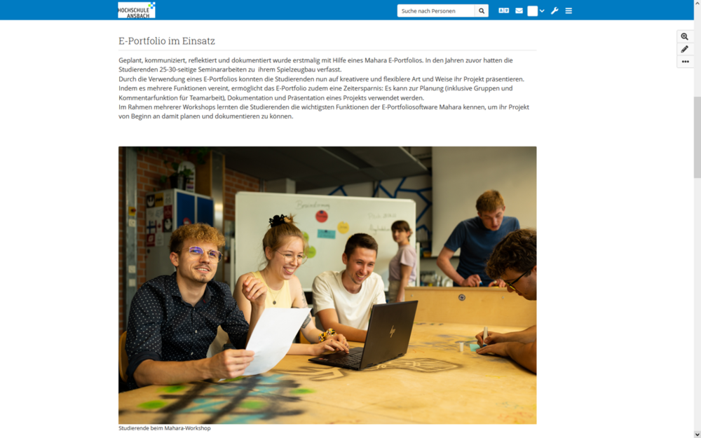 Um auch die hochschulinterne Nutzung von E-Portfolios weiter voranzubringen, stellte Michael Walter bei einem digitalen Erfahrungsaustausch zu alternativen Prüfungsformaten an der Hochschule Ansbach im Juli 2024 die Möglichkeiten von Mahara-E-Portfolios vor. Mehrere Lehrende der Fakultät Medien planen, Mahara ab dem Sommersemester 2025 einzusetzen. Im Oktober 2024 gab Maria Tyroller außerdem einen Workshop für Studierende der Fakultät Wirtschaft, die E-Portfolios im Rahmen des Kurses „Empirische Wirtschaftsanalyse“ unter Leitung von Prof. Dr. Christine Dauth erstmalig nutzen.