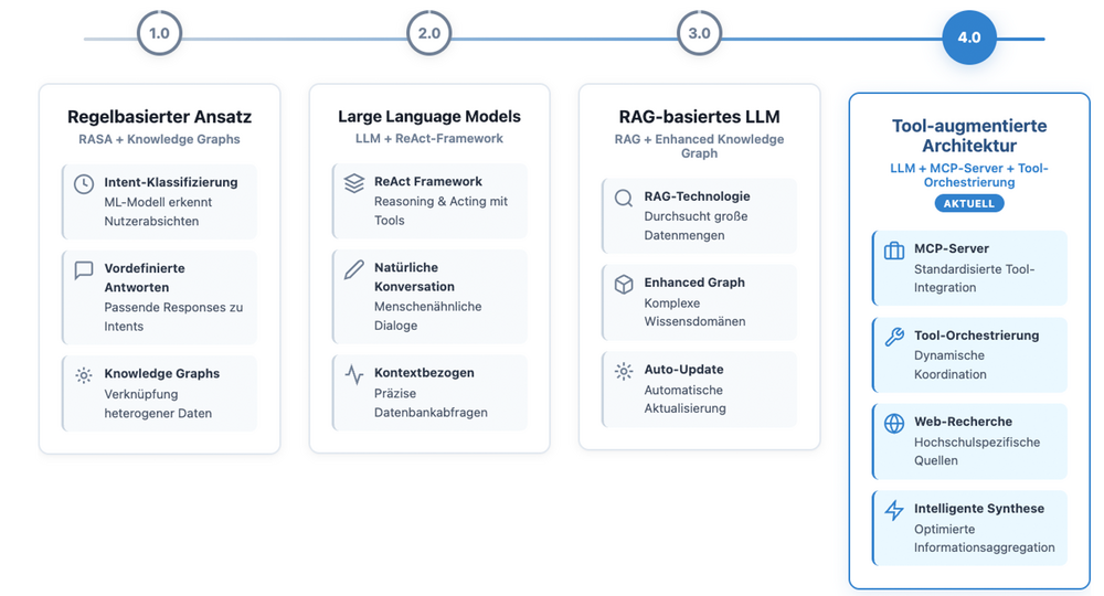 Seit Projektbeginn durchlief der DIAS-Bot vier Entwicklungsgenerationen – vom regelbasierten RASA-System über Large Language Models mit ReAct-Framework und RAG-augmentierten LLMs mit Knowledge Graphs bis zur aktuellen Tool-augmentierten MCP-Architektur. Jede Version brachte einen technologischen Evolutionssprung: von starren Intent-Mustern zu dynamischer Tool-Orchestrierung, von vordefinierten Antworten zu kontextsensitiver Informationssynthese.