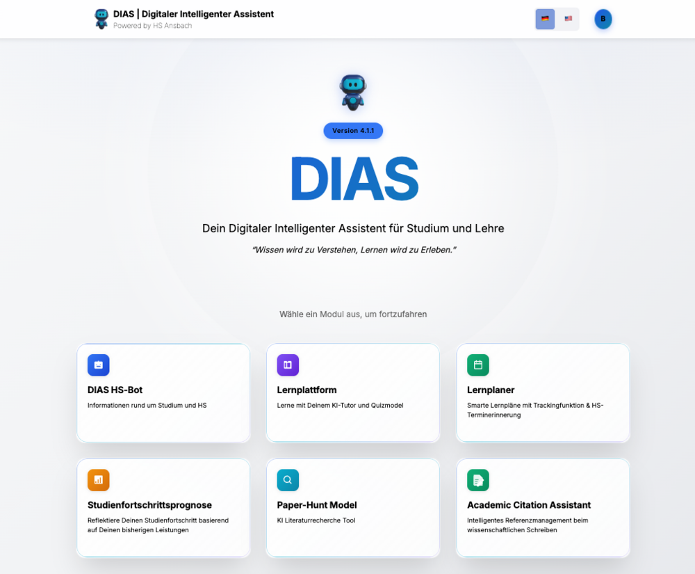 Im Oktober 2021 startete das Forschungsprojekt DIAS (Digitaler Intelligenter Assistent für Studium und Lehre) an der Hochschule Ansbach mit dem Ziel Studierende zu begleiten, zu motivieren und zu befähigen das Studium besser zu organisieren und erfolgreich abzuschließen. DIAS nimmt dabei verschiedene Funktionen als Planer, Motivator, Analysator und Kommunikator ein. Diese Funktionen vereinen sich in DIAS durch die Entwicklung verschiedener KI-basierter Modelle. Studierende interagieren mit DIAS über eine eigene Webapplikation. Ein vorangegangenes Pilotprojekt umfasste zudem Zugriffsmöglichkeiten über die Hochschulwebseite, ein Hologramm und ein Terminal.