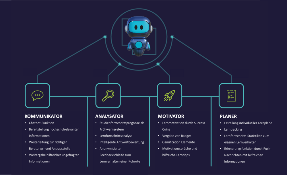 Der Lernplaner als Erinnerungs- und Organisationstool unterstützt Studierende bei der Organisation ihres Studiums und der Verbesserung des Selbstmanagements. Er generiert individuelle Lernpläne, erinnert an Abgabetermine sowie HS-Veranstaltungen. DIAS motiviert Studierende mit Gamification-Elementen, Motivationssprüchen und hilfreichen Lerntipps. Die Studienfortschrittsprognose als Frühwarnsystem unterstützt Studierende individuell anhand ihrer bisherigen Leistungen ihren Studienverlauf zu reflektieren. Der HS-Bot stellt studienrelevante Informationen zentral im System über ein Sprachmodell zur Verfügung. Er gibt rund um die Uhr Auskunft und unterstützt durch Quick Links im Studienalltag.