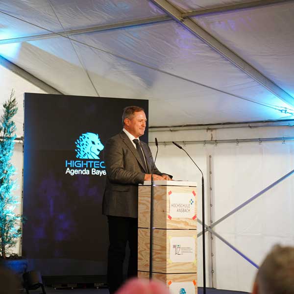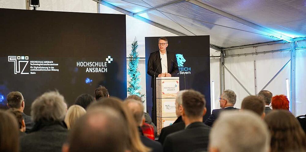 Wissenschaftsminister Markus Blume (MdL) betonte in seiner Ansprache die wichtige Rolle des TTZ Stein als Innovationsmotor für Bayern und als treibende Kraft, die regionale Wirtschaft mit Forschung und Lehre enger zu verbinden: „Notfallmedizin 4.0 – made in Mittelfranken! Im neuen TTZ Stein der Hochschule Ansbach schlägt die Zukunft der Notfallmedizin digital – ein echtes Novum in unserer bayerischen TTZ-Landschaft! Mit Virtual Reality, KI und Simulation bekommt die Aus- und Weiterbildung von Rettungskräften ein wirkungsvolles Update. Hochschule, Industrie und Wirtschaft entwickeln hier passgenaue digitale Lehrwerkzeuge und -konzepte und geben der Rettungskompetenz einen neuen Schub. Das unterstützen wir kraftvoll mit 5,2 Millionen Euro aus der Hightech Agenda Bayern. Mit ihrem vierten TTZ wird die Hochschule Ansbach ihrem Ruf als unsere Premiumhochschule in Mittelfranken mehr als gerecht. Herzlichen Dank an Präsident Müller-Feuerstein und alle regionalen Partner für diesen großartigen Pioniergeist.“