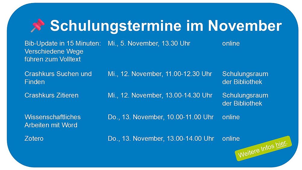 In diesem Semester finden die Kurse teils online, teils in Präsenz statt. Alle Termine und weitere Informationen finden Sie HIER.