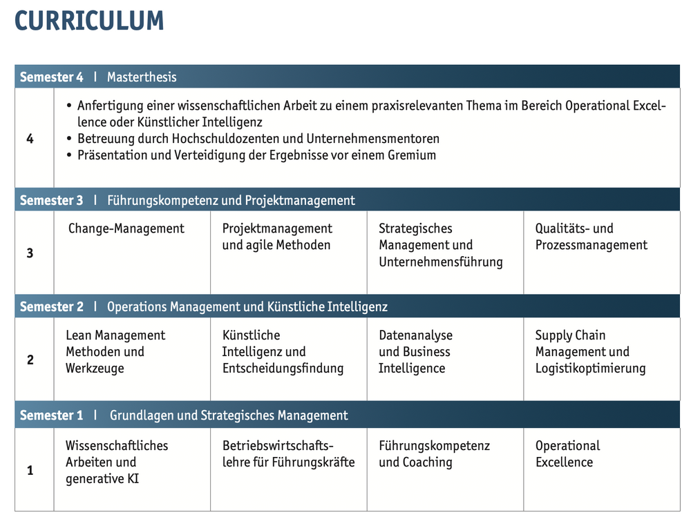 Typische Thesis-Themen reichen von der Einführung eines KI-basierten Qualitäts-Monitors in der Medizintechnik bis zur Implementierung eines Control-Towers zur CO²-Fußabdruck-Messung in der Chemie-Logistik. Die Arbeit folgt den Standards peer-review-fähiger Forschung und wird in einem Kolloquium verteidigt, das Vertreterinnen und Vertreter aus Industrie und Wissenschaft zusammenbringt.