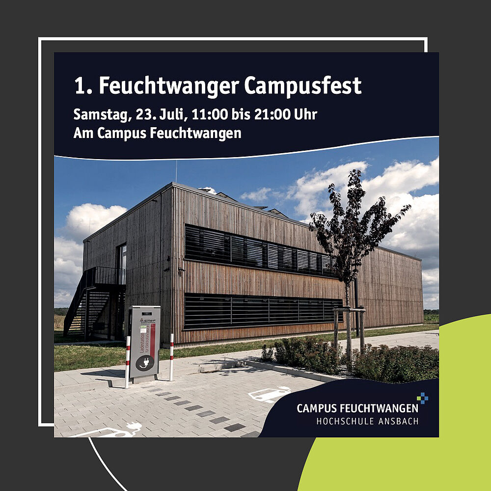 Kommenden Samstag lädt der Campus Feuchtwangen zum 1. Campusfest ein. Von 11:00 bis 21:00 Uhr können Sie unsere jüngste Außenstelle kennenlernen. Im Programm sind neben Campusführungen auch spannende Schnuppervorlesungen und ein Einblick in die Dekarbonisierungsstudie Feuchtwangen. Auf dem Freigelände erwartet Sie eine Infrarot-Fotobox sowie eine Virtual Reality Gebäudeerkundung und ein Drohnenparkour. Das Team vom Campus Feuchtwangen freut sich auf Sie!