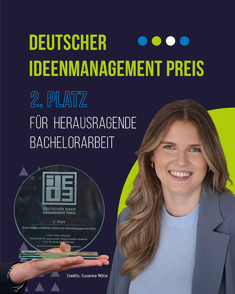 Eine besondere Auszeichnung für eine Alumna der Hochschule Ansbach: Lilian Kastner aus dem Studiengang Angewandte Wirtschafts- und Medienpsychologie (AWM) wurde für ihre herausragende Bachelorarbeit mit dem 2. Platz des Deutschen Ideenmanagement Preis in der Kategorie „Beste wissenschaftliche Arbeit“ ausgezeichnet.