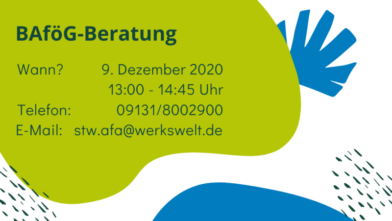 Die neuesten Beschlüsse lassen es leider nicht zu, die BAföG-Beratung in persönlicher Form stattfinden zu lassen. Trotzdem steht Herr Buchner vom Studentenwerk Erlangen-Nürnberg am Mittwoch, den 9. Dezember, in der Zeit von 13:00 bis 14:45 Uhr telefonisch und per E-Mail für Ihre Fragen zur Verfügung.