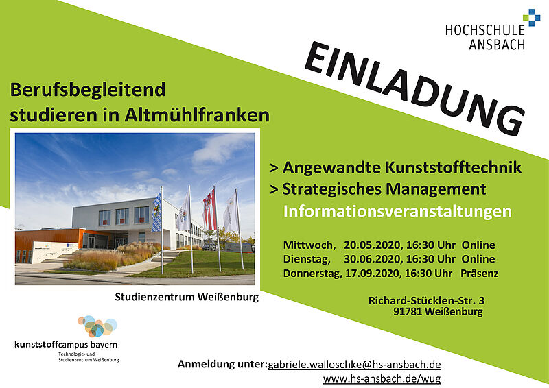 Auch im Sommersemester 2020 finden wieder Informationsveranstaltungen für die berufsbegleitenden Bachelor-Studiengänge Angewandte Kunststofftechnik (AKT) und Strategisches Management (SMA) am kunststoffcampus bayern in Weißenburg statt: