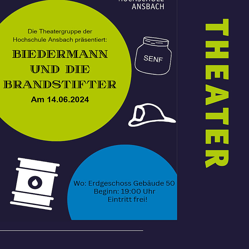 Am Freitag, den 14. Juni um 19.00 Uhr, präsentiert unsere Hochschultheatergruppe im Foyer von Gebäude 50 eine gekürzte Fassung von Max Frischs "Biedermann und die Brandstifter", welche unter Regie der Theaterpädagogin Natascha Lifka vom Theater Ansbach einstudiert wurde.