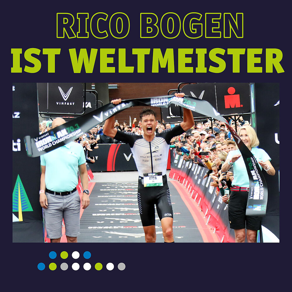 Rico Bogen hat bei der Ironman-70.3-Weltmeisterschaft im finnischen Lahti als Erster die Ziellinie überquert. Mit einer Zeit von 3:32:21 Stunden ist er neuer Rekordhalter auf der Halbdistanz und zugleich jüngster Weltmeister. Ironman 70.3 ist eine Variante des Triathlons. Der Name leitet sich von der zurückgelegten Distanz, 70,3 Meilen (ca. 113 Kilometer) ab.