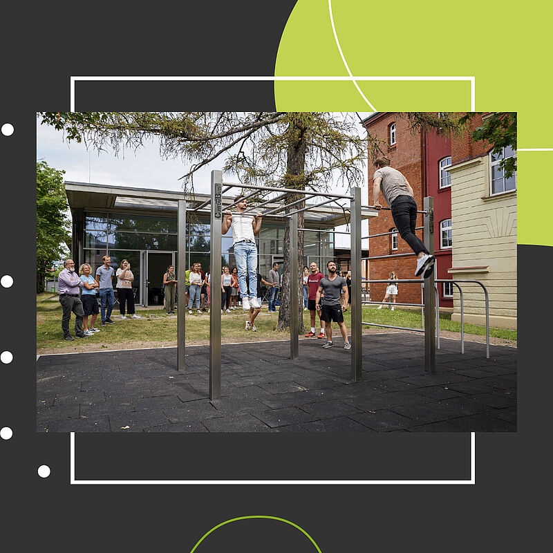 Die Hochschule Ansbach hat nun eine Calisthenics-Station auf dem Campus. Vertreter*innen der Hochschulleitung haben sie gestern zusammen mit Studierenden feierlich eingeweiht. Die knapp 60m² große Fläche zwischen der Mensa und Gebäude 50 dient zum Training mit Eigengewicht.