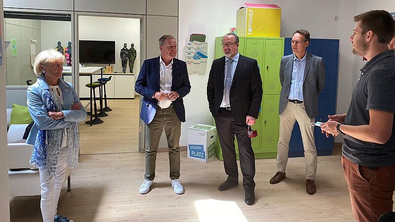 Im Bild: Wissenschaftliche Leiterin des Pixel Campus Prof. Renate Hermann (li.), Vizepräsident der Hochschule Ansbach Prof. Dr.-Ing. Sascha Müller-Feuerstein Mitte), Vizepräsident der Hochschule Ansbach Prof. Dr.-Ing. Ulf Emmerich (2.v.r.) und Operativer Projektleiter des Pixel Cmpus Fabian Tremel gemeinsam mit Dr. Wolfgang Heubisch (2.v.l.) in den Räumlichkeiten des Pixel Campus.