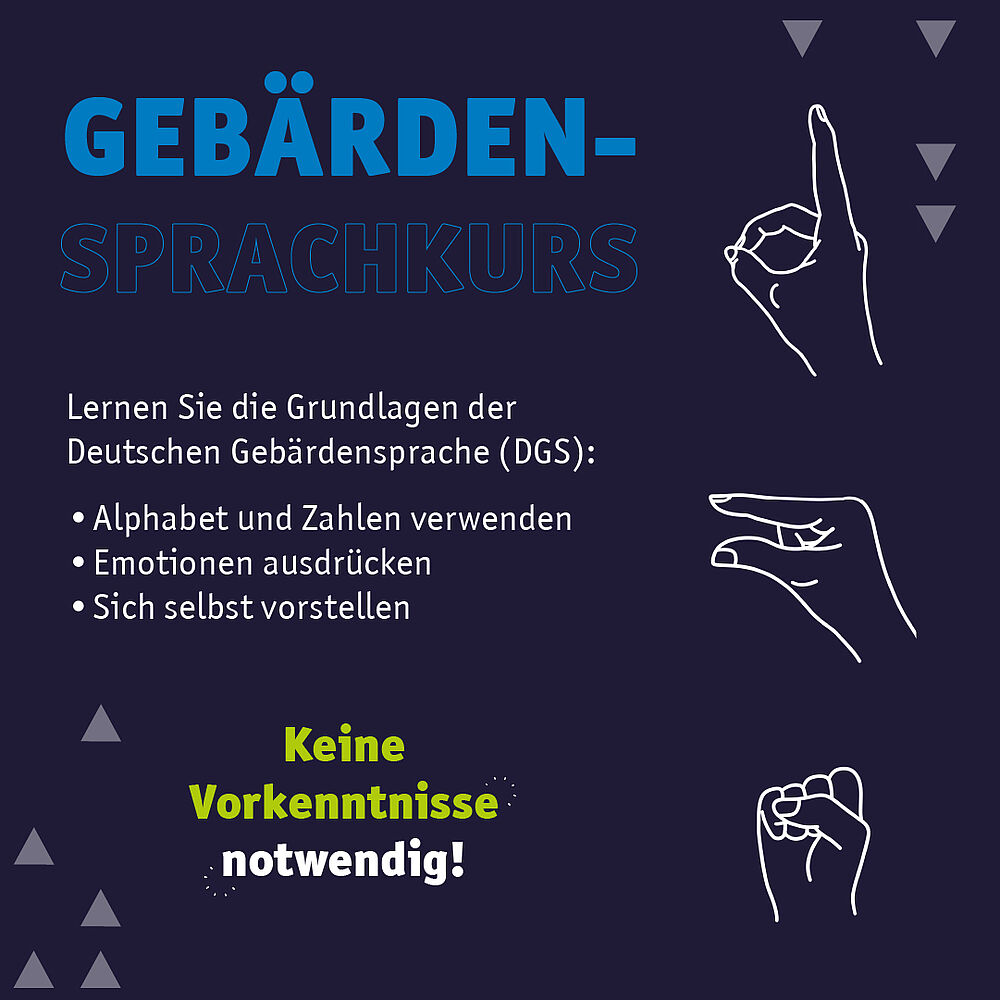In dem Kurs haben Sie die Gelegenheit, die Grundlagen der Deutschen Gebärdensprache zu erlernen, bei der auch Mimik und Lippenlesen eingesetzt werden. Sie lernen unter anderem das Alphabet und Zahlen, wie Sie Emotionen ausdrücken können und sich selbst vorstellen.