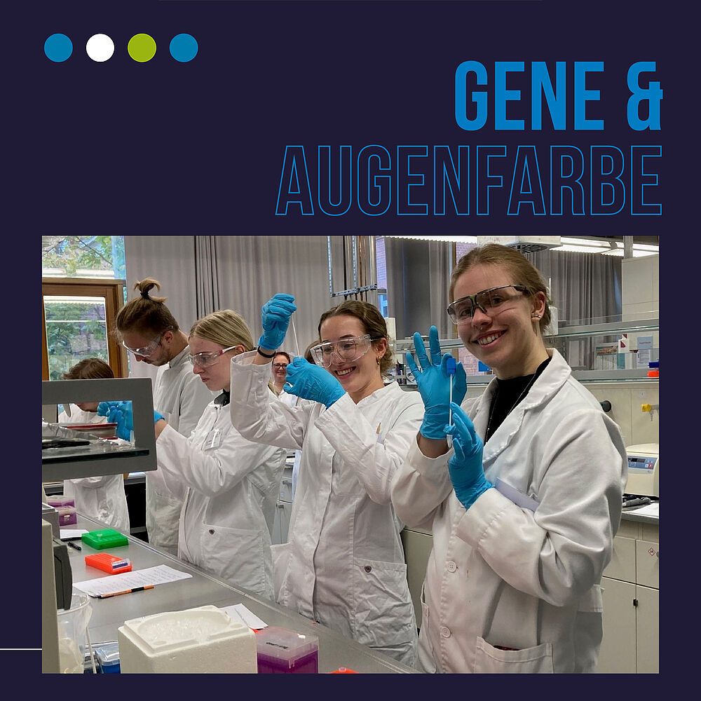 Je nachdem, wie genau die Sequenz aus den vier Bausteinen Adenin, Cytosin, Thymin und Guanin an dieser Stelle beschaffen ist, kann vorhergesagt werden, ob eine Person eher blau- oder braunäugig ist. Am Ende überprüfen die Studierenden, ob die genetische Vorhersage auch tatsächlich zutrifft.