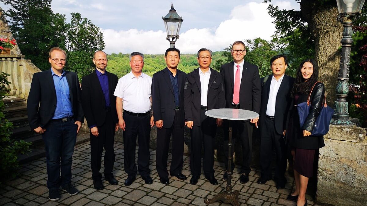 Im BIld (v.l.n.r.): Dr. Patrick Gröner, Dr. Christian Gebhard, Prof. Dr. Xianjun Lyu, Prof. Dr. Yang Zhou, Prof. Dr. Shaopeng Wang, Prof. Dr. Norbert Kaiser, Prof. Dr. Guigang Dong, Ms. Yunfeng Niu