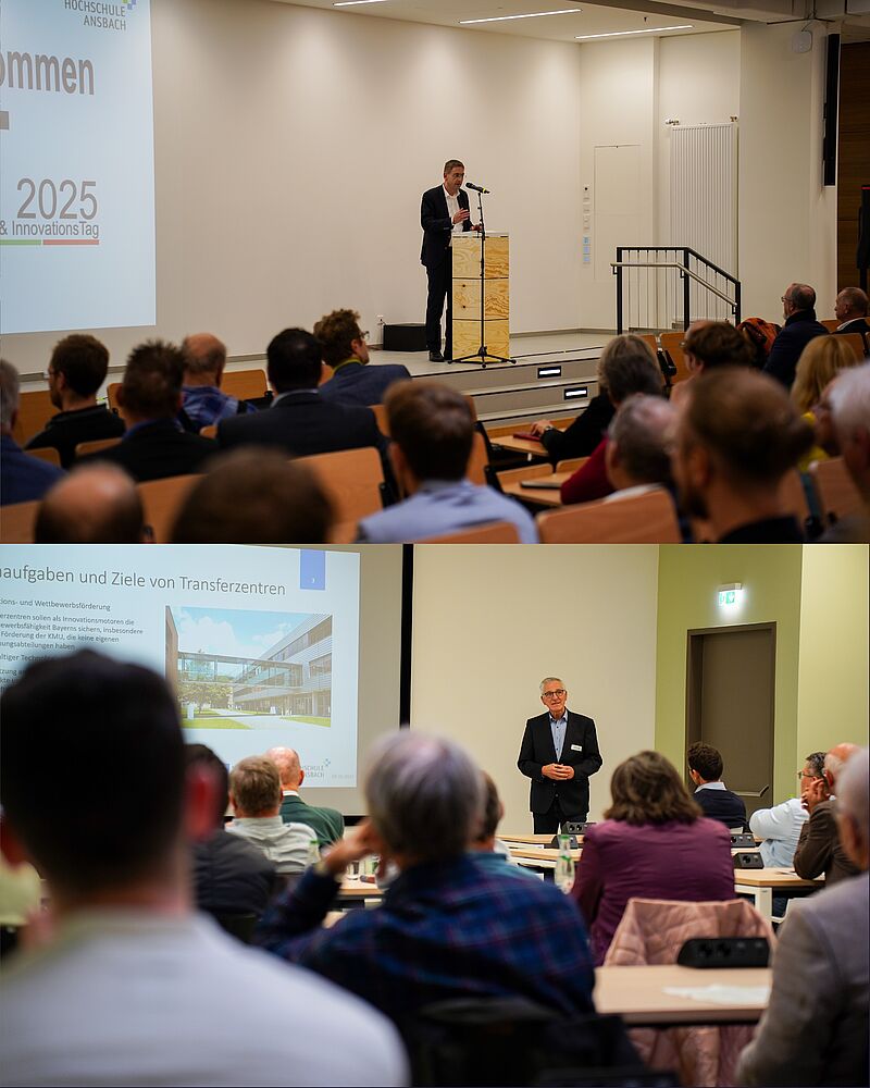 In kompakten Präsentationen stellten Forschende der Hochschule sowie regionale Fach- und Führungskräfte innovative Projekte aus den Bereichen Technik, Wirtschaft und Medien vor. Das TAKE | Transferzentrum Ansbach | Klimaschutz & Effizienz und das Mittelstand-Digital Zentrum Franken begleiteten den FIT 2025 mit praxisnahen Beiträgen zu Nachhaltigkeit und Digitalisierung.