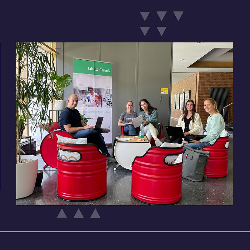 Bisher gab es in den Gebäuden 51 und 92 wenig Möglichkeiten, sich als Gruppe zusammenzusetzen. Daher haben die Fakultäten Technik und Medien zusammen neue Sitzplätze geschaffen, in Form von Tonnenmöbeln. Diese wurden bereits gut von den Studierenden angenommen. In Zukunft können sie diese Bereiche zum Beispiel für Gruppenarbeiten, Gespräche oder auch Pausen nutzen.