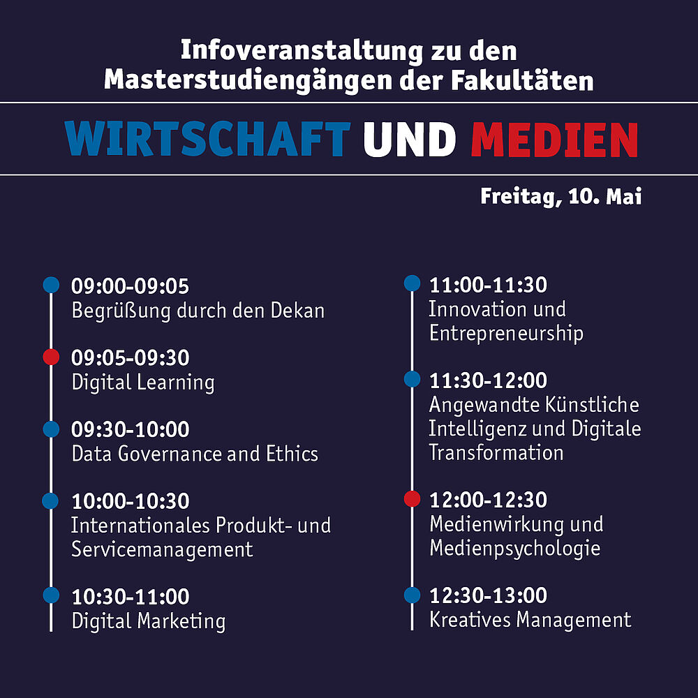 Am Freitag, den 10. Mai, findet eine Informationsveranstaltung für die Masterstudiengänge der Fakultäten Wirtschaft und Medien statt. Entdecken Sie unsere weiterbildenden Studienangebote kompakt in kurzen Vorstellungen. Folgendes Programm ist geplant: