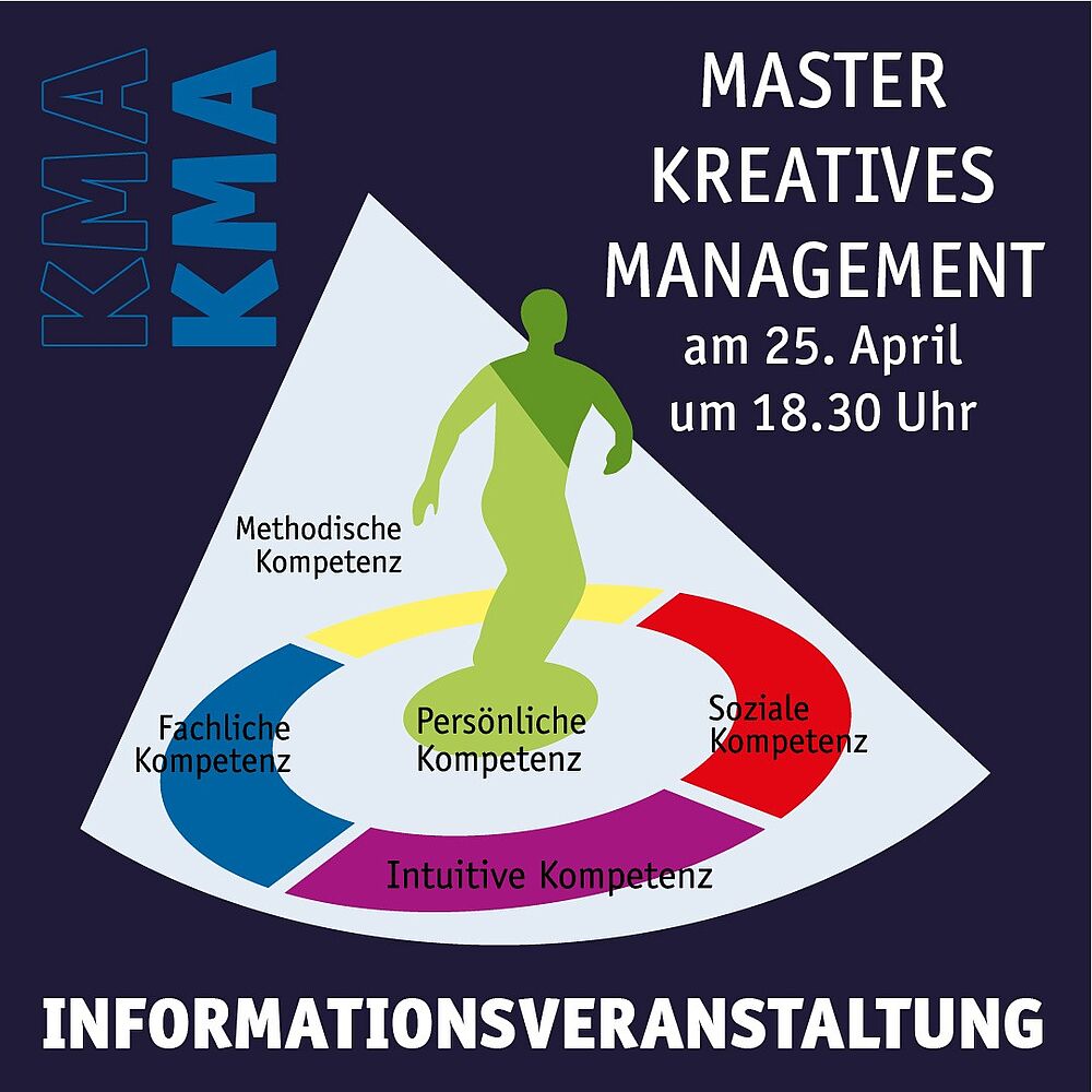 Am kommenden Dienstag, den 25. April 2023 , findet eine virtuelle Infoveranstaltung zu unserem berufsbegleitenden Masterstudiengang Kreatives Management (KMA) statt.