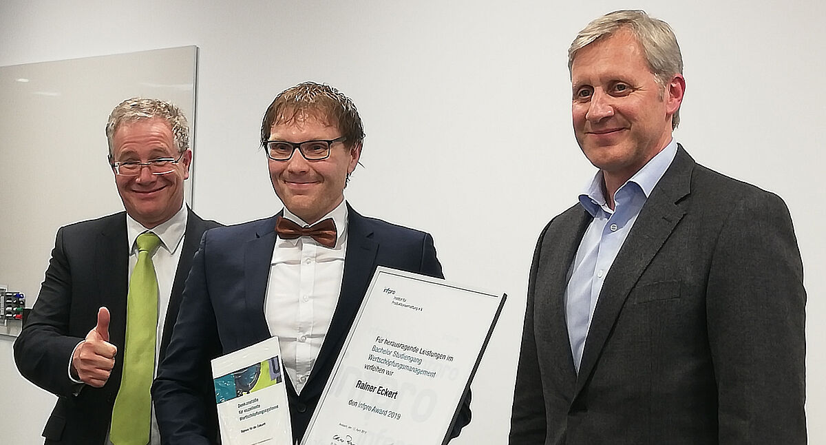 Während der Abschlussfeier wurde durch Dr. Oliver Prause, Vorstandsvorsitzender des Instituts für Produktionserhaltung e.V. (Infpro e.V.), und Prof. Dr. Constantin May, Studiengangsleiter "Wertschöpfungsmanagement" und Mitglied im wissenschaftlichen Kuratorium von Infpro e.V., der mit 1.000 Euro dotierte Infpro-Award sowie eine einjährige kostenlose Mitgliedschaft im Infpro e.V. an den besten Absolventen dieses Jahrgangs, Rainer Eckert, verliehen.