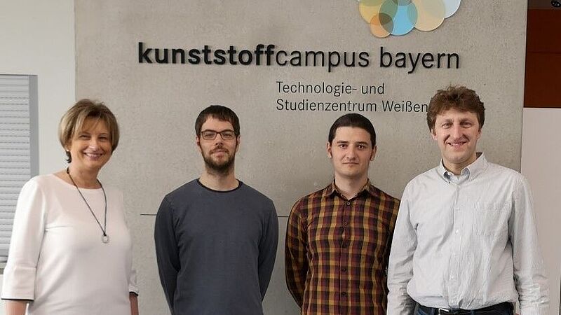 Bild: Gabriele Walloschke (Studiengangassistentin AKT, li.) und Prof. Dr.-Ing. Alexandru Sover (Studiengangsleiter AKT, re.) begrüßen Marius-Andrei Boca und Julian Auer am Studienzentrum des kunststoffcampus bayern