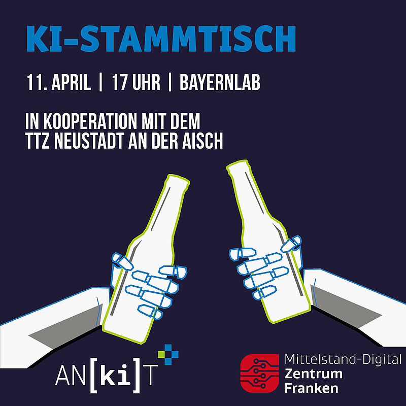 Am Donnerstag, den 11. April findet um 17 Uhr der nächste KI-Stammtisch im Bayern Lab in Neustadt an der Aisch (Bamberger Straße 48) statt. Dieses Mal veranstaltet vom Mittelstand-Digital Zentrum Franken in Zusammenarbeit mit dem Technologietransferzentrum (TTZ) Neustadt an der Aisch. Das TTZ setzt sich unter der Leitung der Hochschule Ansbach für die nachhaltige Stärkung der Innovationskraft in der Region ein.