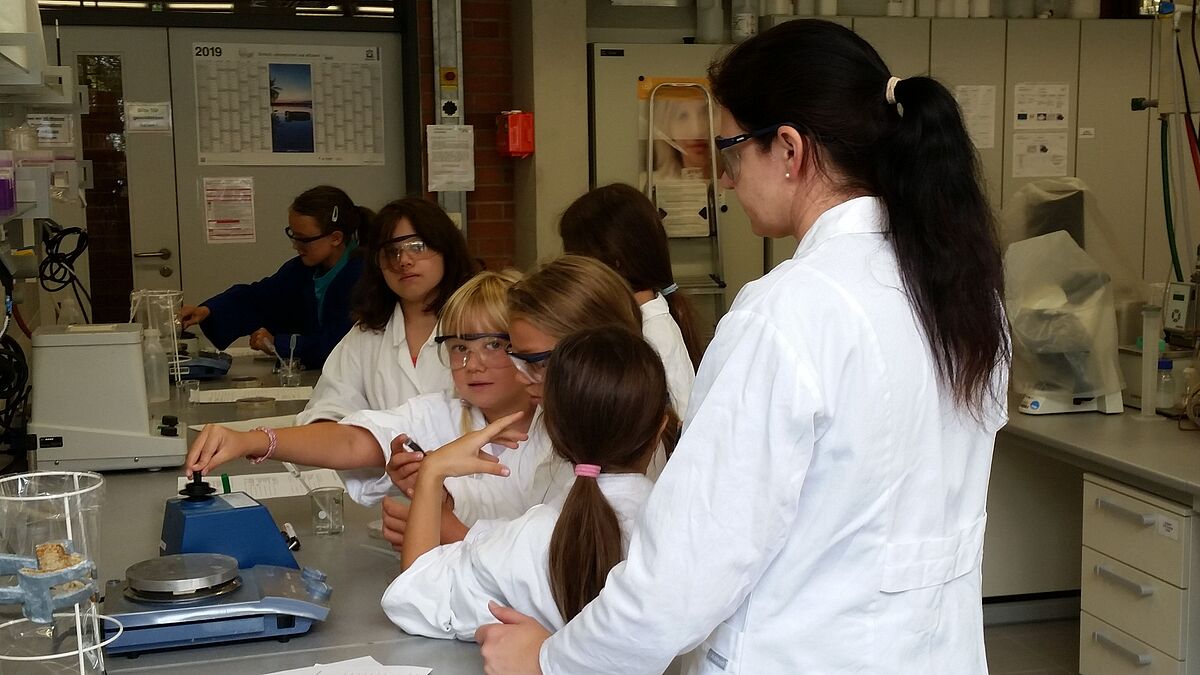 Erster Pflichttermin für die kleinen Forscher*innen war die Sicherheitsunterweisung im großen Stufenhörsaal, der bei den Kindern für Begeisterung und bei den Lehrkräften für nostalgische Gefühle sorgte. Nach erfolgreichem Absolvieren des Sicherheitstests bekam jedes Kind sein Laboreinsteiger-Diplom und wurde mit Schutzbrille und Labormantel ausstaffiert.