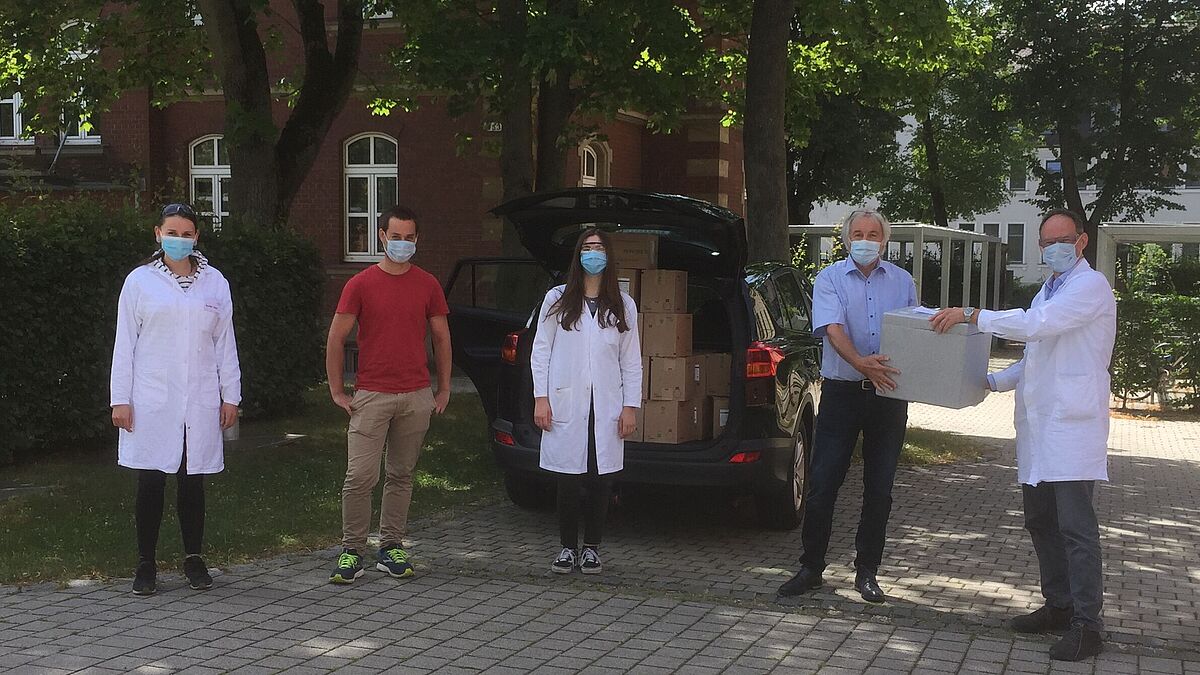 Im Bild (v.l.n.r.): Annabell Kress, Manuel Schmidt, Lena Tarantik und Prof. Fabritius bei der Übergabe einiger Produktchargen an Prof. Steinkasserer