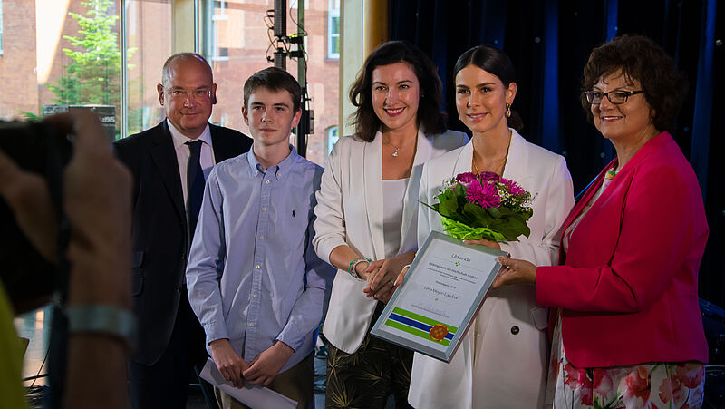 Foto: Thomas Schreiber, Lukas Pohland, Staatsministerin Dorothee Bär, Preisträgerin Lena Meyer-Landrut und Präsidentin Prof. Dr.Ute Ambrosius; © Christian Hiemisch