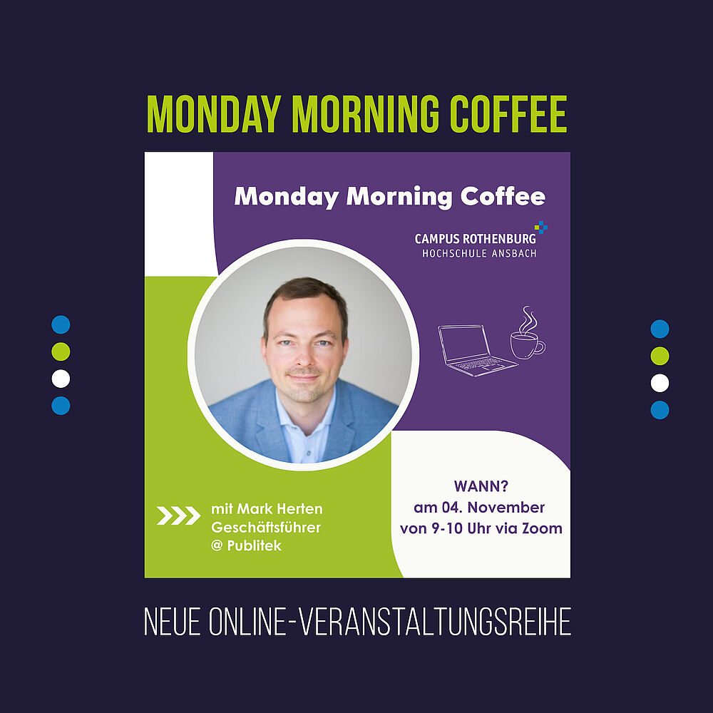 Wir freuen uns, Sie zur neuen Online-Veranstaltungsreihe „Monday Morning Coffee“ einzuladen. An drei Terminen im Wintersemester erwarten Sie spannende Einblicke von Experten sowie die Möglichkeit zum fachlichen Austausch.