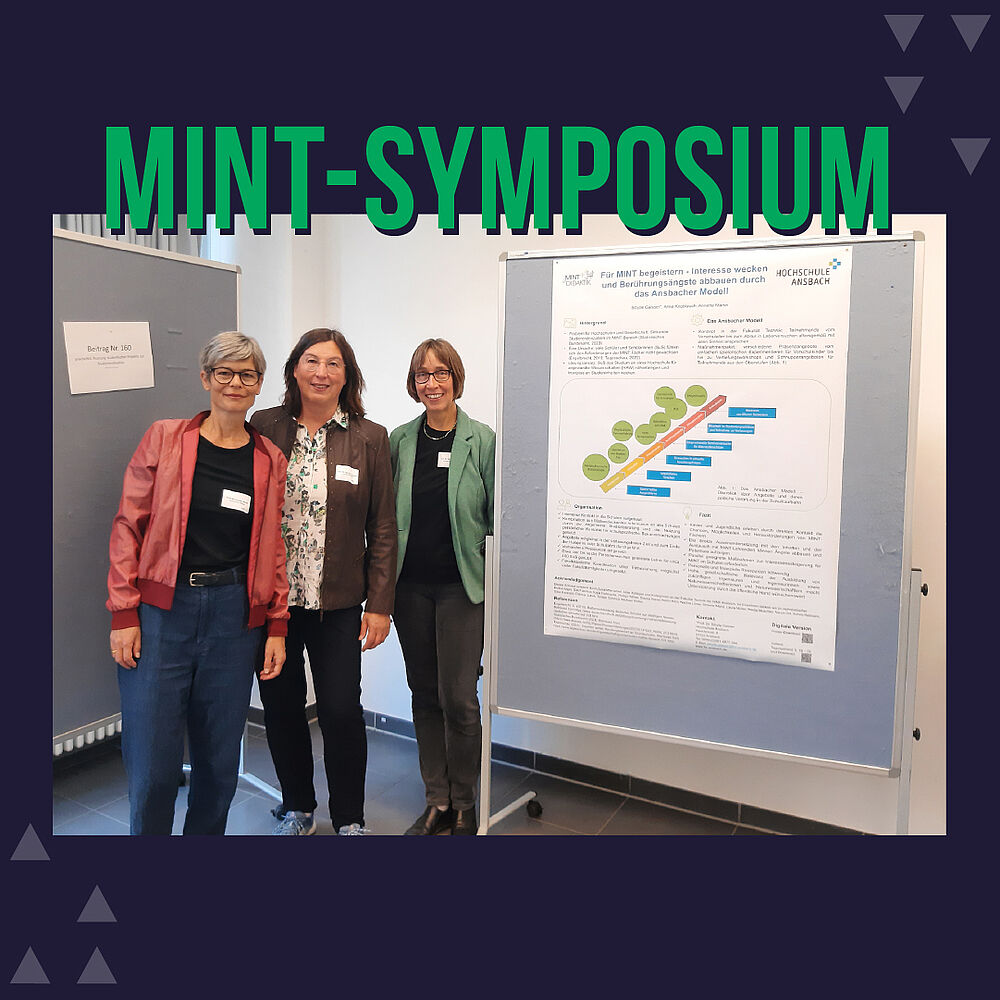 Auch die Hochschule Ansbach war mit zwei Postern vertreten: Zum einen präsentierten die Professorinnen Annette Martin, Anke Knoblauch und Sibylle Gaisser (v.l.n.r.) unseres Bachelorstudiengangs Industrielle Biotechnologie (IBT) das Ansbacher Modell. Dieses Modell zielt darauf ab, das Interesse der Schülerinnen und Schüler vom Vorschulalter bis zum Studienbeginn für MINT-Themen zu wecken und Berührungsängste zu reduzieren.
