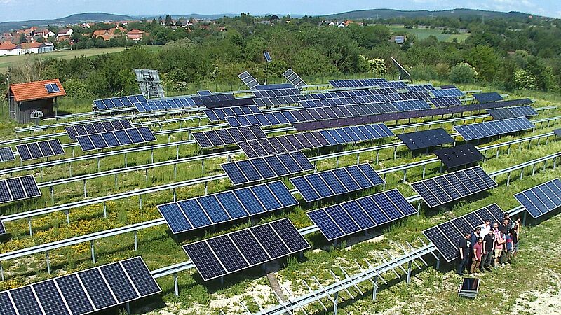 Im Schulungsbereich konnten die Studierenden mit Akkuschraubern und vereinten Kräften den Aufbau verschiedener Montagesysteme selbst erproben. Den krönenden Abschluss bildete eine Begehung des Versuchsfeldes (siehe Bild), wo unter anderem völlig neue Konzepte im Freilandversuch bewertet und optimiert werden.