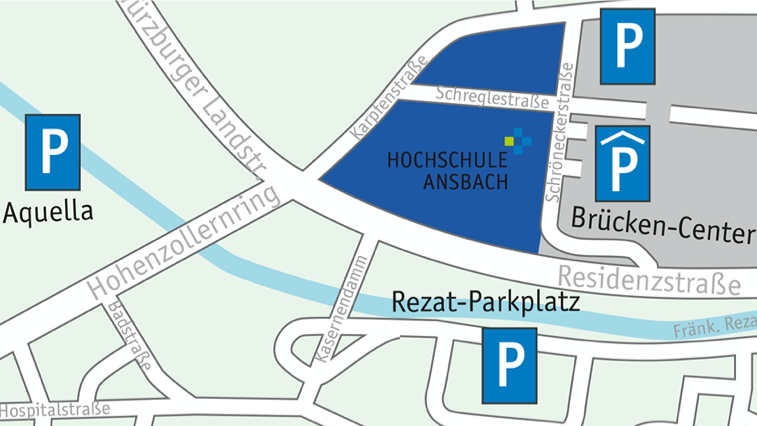 Nur wenige Minuten Fußweg entfernt finden Sie - ohne eine Lücke suchen zu müssen - kostenlose Parkplätze am Aquella. Alternativ können Sie kostenpflichtig im BrückenCenter oder am Rezat-Parkplatz parken.