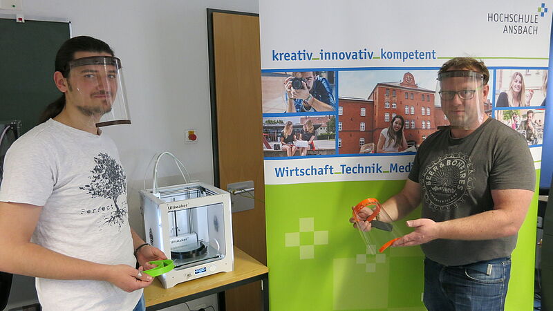 Ein engagiertes Team der Fakultät Technik rund um die Professoren Michael Walter, Mathias Moog und Alexandru Sover sowie Laboringenieur Robert Nierlich (rechts im Bild) und Wissenschaftlichen Mitarbeiter Marius-Andrej Boca (links im Bild) hat sich zusammengetan und druckt an der Hochschule und auf privaten Geräten die dringend benötigten Schutzmasken. Auch die ersten Studierenden helfen mit und erstellen auf ihren eigenen 3D-Druckern anhand frei verfügbarer Konstruktionsdaten Schutzausrüstung.