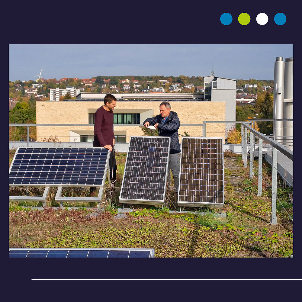 Im Bild (v.l.n.r.): Daniel Schultheiß (wissenschaftlicher Mitarbeiter) und Dieter Jarosch (Laboringenieur) inspizieren die Solarmodule des Inselstromnetzes.