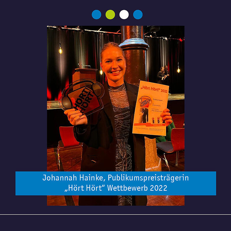 Drei Beiträge unseres Campusradios „Rabbit Radio“ sind beim fränkischen Hörwettbewerb „Hört Hört“ ausgezeichnet worden. Über den Publikumspreis kann sich Rabbit Radio-Autorin Johannah Hainke freuen. In ihrem Beitrag „They started a war" berichtet sie über den Alltag der ukrainischen Studentin Viktoria mitten im Kriegsgebiet.