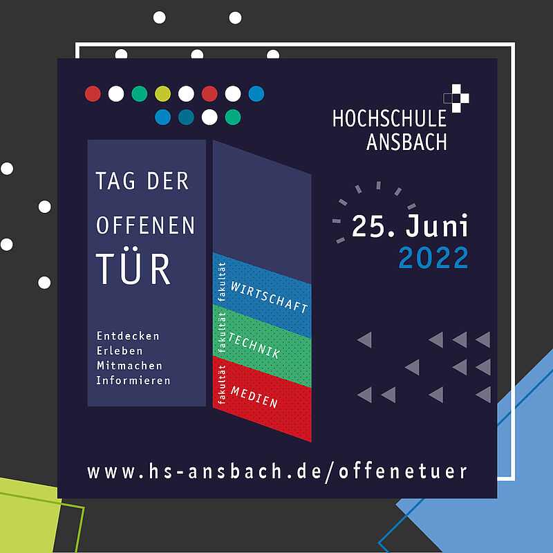 Auch in diesem Jahr gibt es wieder einen Tag der offenen Tür an der Hochschule Ansbach. Dieses Mal wieder in Präsenz, haben Interessierte am 25. Juni die Möglichkeit, von 9 bis 14 Uhr unser vielfältiges Studienangebot und den Campus vor Ort kennenzulernen. Zudem gibt es Informationen über Bewerbung und Zulassung. Darüber Hinauswerden Laborbesichtigungen und Mitmachaktionen angeboten. Mit dabei sind auch das International Office, der Studierendenservice, unsere Fachschaft und weitere Bereiche der Hochschule.