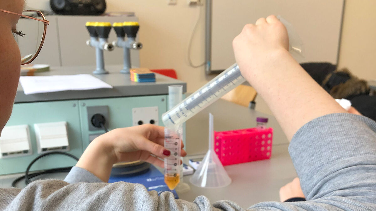 Unter Leitung von Prof. Dr. Annette Martin und Laboringenieurin Katja Frohnapfel extrahierten die Neuntklässler*innen zunächst DNA aus einer Tomate. „Eine grundlegende Technik der Biotechnologie“, betonte Prof. Martin, „denn ausgehend von DNA können nicht nur Schäden im Erbgut identifiziert werden, sondern auch - wie beim genetischen Fingerabdruck - Individuen eindeutig identifiziert werden.“
