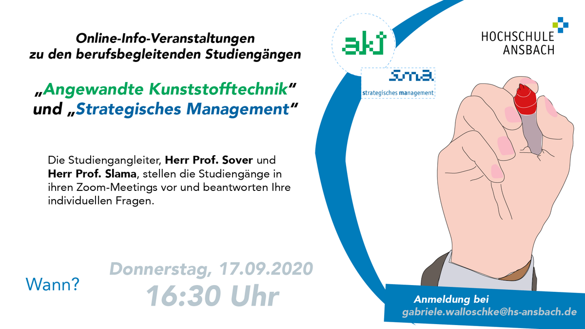 Für die beiden berufsbegleitenden Bachelor-Studiengänge Angewandte Kunststofftechnik (AKT) und Strategisches Management (SMA) am Campus Weißenburg endet die Bewerbungsfrist am 30. September. Um einen Einblick in AKT und SMA zu ermöglichen, findet am Donnerstag, den 17. September, um 16.30 Uhr jeweils eine Online-Info-Veranstaltung statt.