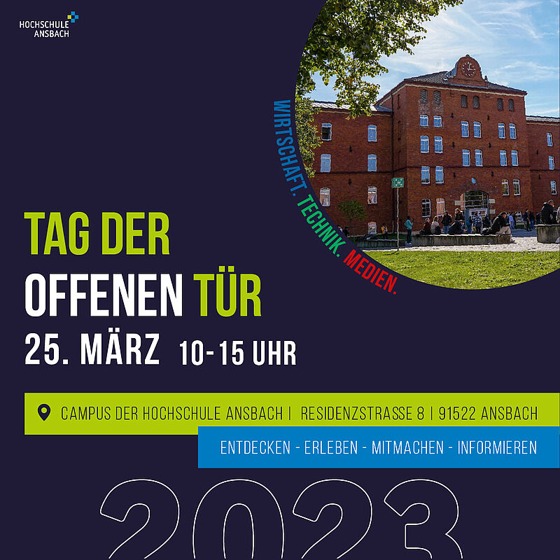 Am Samstag, 25. März 2023 findet der Tag der offenen Tür an der Hochschule Ansbach statt. Von 10 bis 15 Uhr öffnen wir unsere Türen für Studieninteressierte und ihre Familien sowie für alle hochschulinteressierten Personen aus der Region.