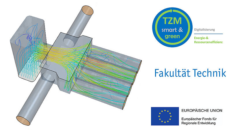 Das TZM smart & green Team erstellte ein numerisches Modell des Via Vento S Lüftungsnetzwerks und führte an diesem Modell Untersuchungen zum Druckverlust, der Aeroakustik und der Gleichverteilung der Strömung durch. Durch die Simulationen konnten Handlungsempfehlungen für den Belegungszustand gegeben werden, bei dem der Verteiler bestmöglich durchströmt wird. Mit einer Strömungsführung innerhalb des Querverteilers wurde eine Verbesserung der Gleichverteilung erreicht. Die Erkenntnisse der Untersuchungen fließen derzeit in die Produktweiterentwicklung mit ein. Die Berechnungen wurden bei Erlus in Versuchen und auch in der Praxis bestätigt: