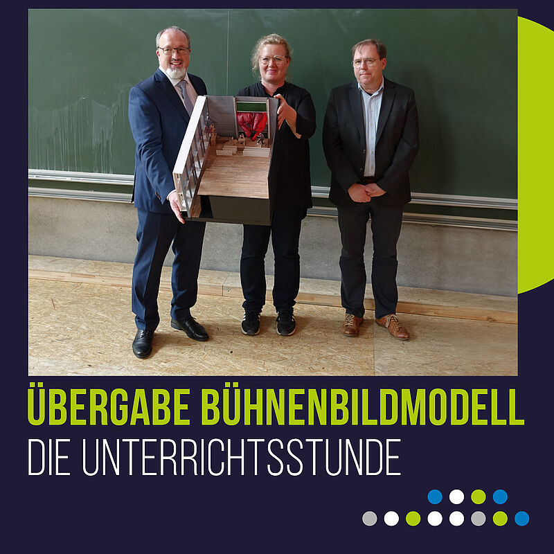 Als Zeichen der Dankbarkeit für die großartige Zusammenarbeit mit der Hochschule Ansbach wurde der Hochschulleitung nun das Bühnenbildmodell des Theaterstücks überreicht. Der Präsident Prof. Dr.-Ing. Sascha Müller-Feuerstein nahm dieses besondere Kunstwerk von der Bühnenbildnerin Christina Wachendorff und dem Intendanten Axel Krauße vom Theater Ansbach persönlich entgegen.