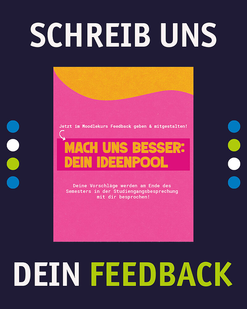 Über das Online-Portal Moodle können Sie im neu geschaffenen „Ideenpool“ Anregungen und Kritik anonym posten. Im Anschluss wird das eingereichte Feedback direkt an die jeweils zuständigen Bereiche der Studiengänge weitergeleitet. Ziel ist es, dadurch zeitnah, kompetent und wertschätzend auf Kritik reagieren zu können.