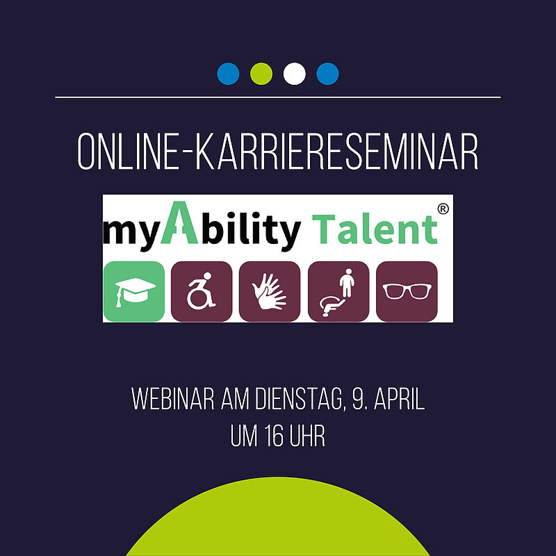 Am Dienstag, den 9. April, stellt sich um 16 Uhr das neue myAbility Talent® Programm in einem Webinar vor. Das Online-Karriereseminar in Zusammenarbeit mit dem Career Service bietet für Studierende und Absolventen mit Beeinträchtigung(en) ein Forum, auf dem bis zu einem Dutzend inklusionsoffene Organisationen qualifizierte Nachwuchskräfte kennenlernen und individuelle Lösungen angesichts von Barrierefreiheits-Anforderungen am Arbeitsplatz finden wollen.