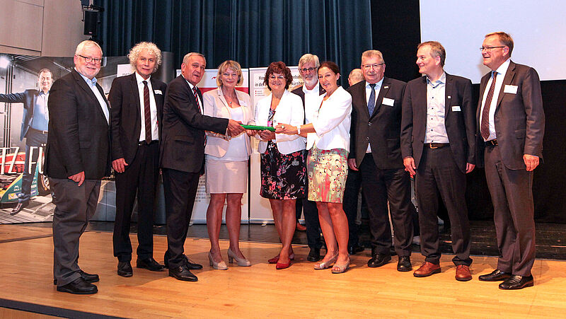 Im Bild (v.l.n.r.): Prof. Dr. Dr. habil. Godehard Ruppert (Fachlicher Sprecher Forum Wissenschaft und Präsident der Otto-Friedrich-Universität Bamberg), Wolfgang Lippert (Landrat Landkreis Tirschenreuth), Kurt Seggewiß (Oberbürgermeister Stadt Weiden), Prof. Dr. Andrea Klug (Präsidentin Ostbayerische Technische Hochschule Amberg-Weiden), Prof. Dr. Ute Ambrosius (Präsidentin Hochschule Ansbach), Kurt Unger (Stv. Landrat Landkreis Ansbach), Carda Seidel (Oberbürgermeisterin Stadt Ansbach), Gerhard Wägemann (Politischer Sprecher Forum Wissenschaft und Landrat des Landkreises Weißenburg-Gunzenhausen), Horst Müller (Geschäftsführer Forum Wissenschaft und Referent für Wirtschaft und Wissenschaft der Stadt Fürth) und Andreas Starke (Ratsvorsitzender Metropolregion Nürnberg und Oberbürgermeister Stadt Bamberg). Foto: Sonja Wiesel/OTH Amberg-Weiden